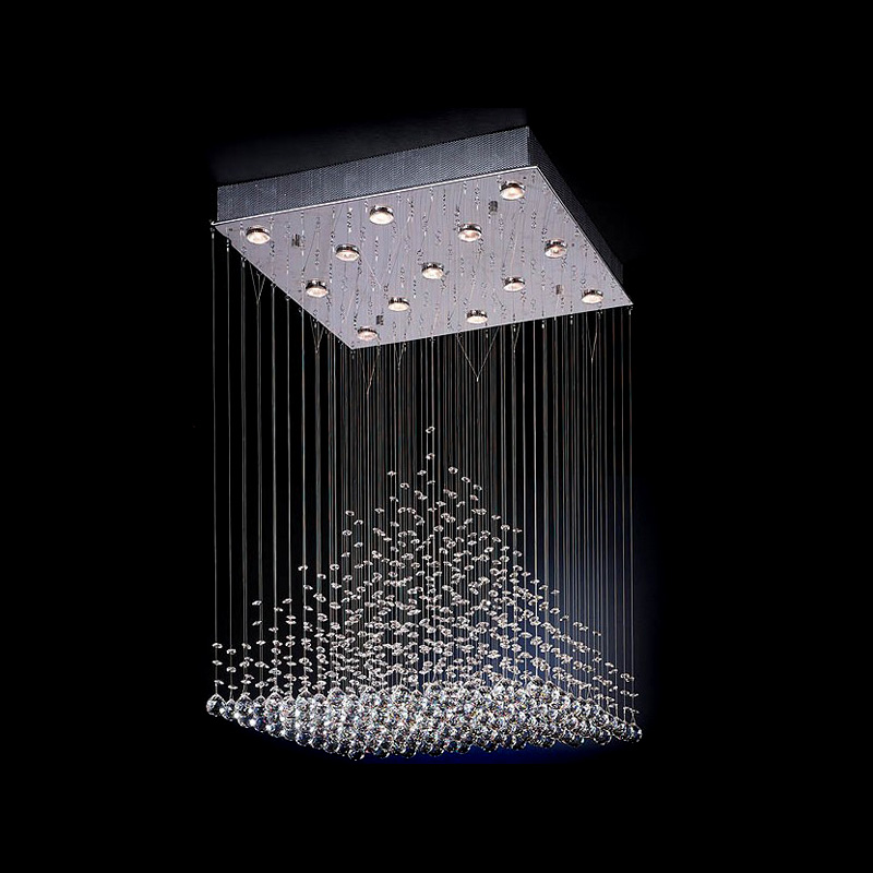 Легкая и воздушная потолочная люстра Estratos представляет собой стальные нити, увешанные стразами сваровски в виде пирамиды. Люстру легко вписать в любой интерьер, она прекрасно сочетается с любым светом из страз cваровски. Перед покупкой такого объекта необходимо проконсультироваться со специалистами по решению вопроса монтажа.