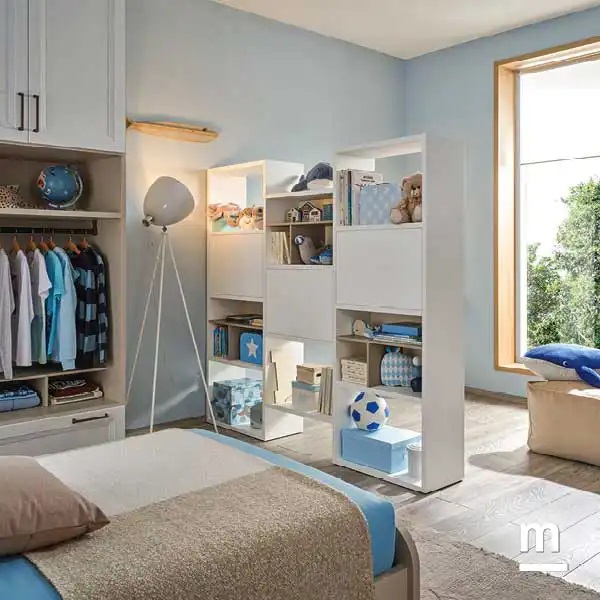 Вопрос организации и функциональности: разделение детской на рабочую и спальную зоны становится все более актуальным выбором. Наиболее практичным и экономичным решением для разделения пространства является открытая книжная полка. Не закрывая пространство полностью, делая комнату, наоборот, особенной и динамичной. Структура книжного шкафа Outline легкая и ритмичная, в ней чередуются открытые отсеки с небольшими шкафчиками.