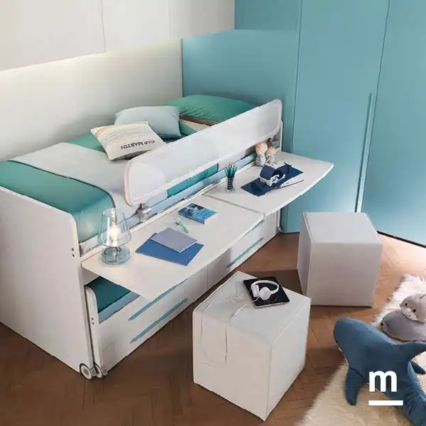 Кровать с выдвижными столами. Такая модульная система позволяет обустроить детскую для двоих, в том числе когда размеры комнаты ограничены.