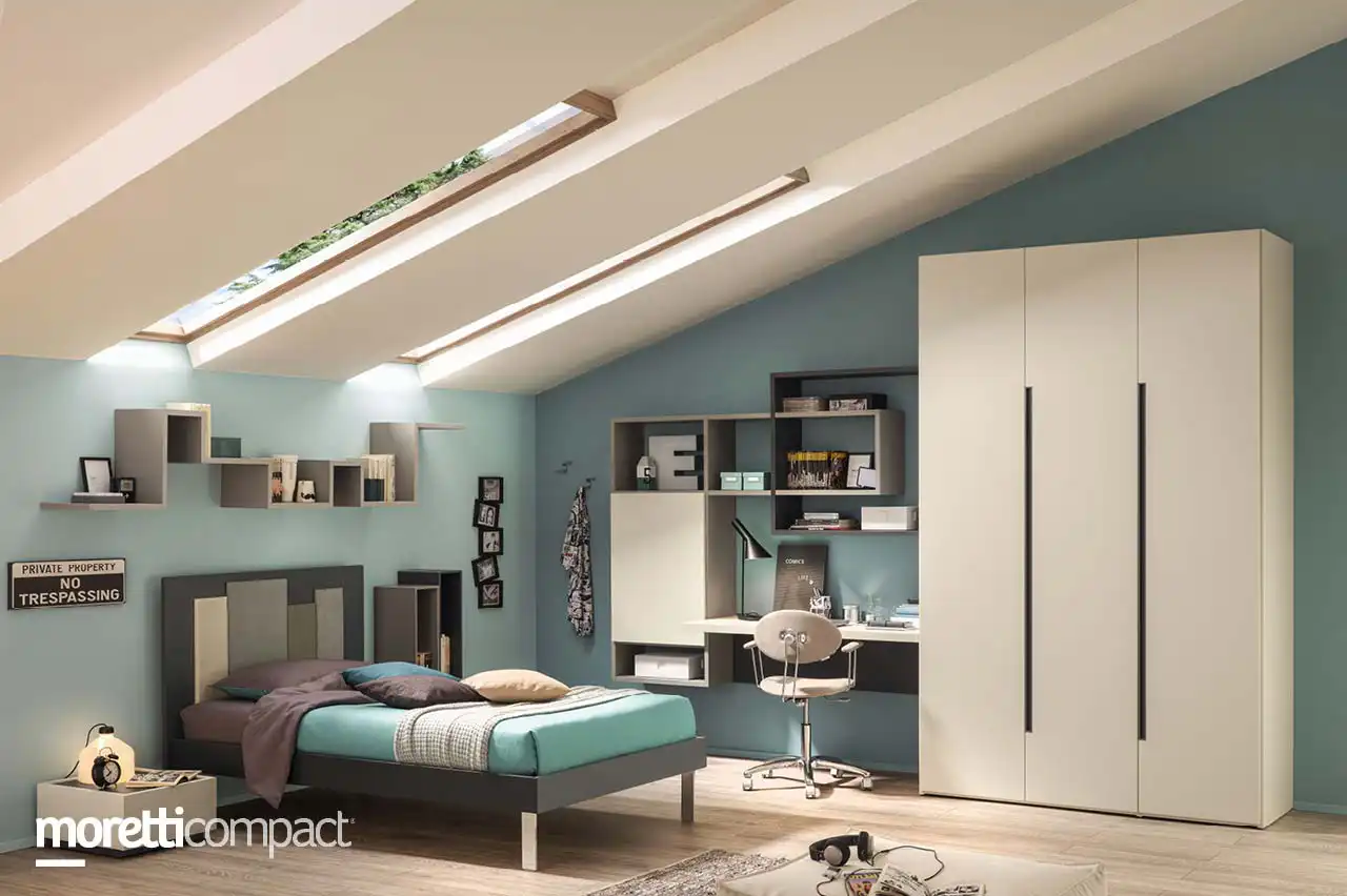 Комната с распашным шкафом, письменным столом и кроватью. Индивидуально оформленная комната, где можно спокойно расти и эффективно учиться, — идеальный вариант для подросткового возраста. Подростки взрослеют, их вкусы становятся более четкими и сформированными: комната должна быть прочной и долговечной, но прежде всего комфортной, местом, где они хотят оставаться и приглашать своих друзей. Поэтому комната должна быть не только красивой и хорошо обставленной, но и экологичной.