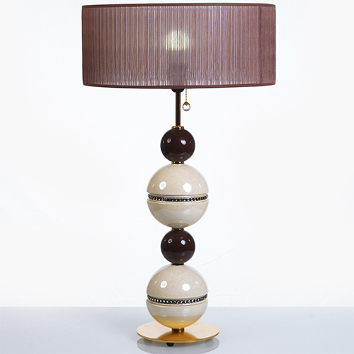 Каркас настольной лампы фабрики BONDIA выполнен из идеально золоченого хрома, который изумительно сочетается с керамикой двух цветов: коричневого мрамора с вкраплениями и аворио. Форма абажура повторяет форму круглых керамических элементов лампы, а кристаллы сваровски делают всю лампу просто божественной. Абажур выполнен из тончайшей органзы, цвет которой повторяется в керамике и образ становится абсолютно завершенным. Настольная лампа благодаря своей форме и изысканному цветовому сочетанию способна органично вписаться в самые разные интерьеры.